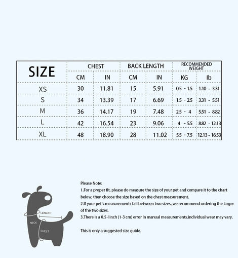 Choose based on the pet's chest circumference or weight. If the two-legged clothes are too tight, they will restrict movement; if they are too loose, they are prone to falling off.