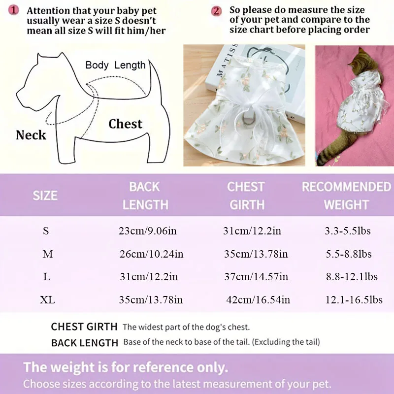SPECIFICATIONSBrand Name: NoEnName_NullCN: ZhejiangChoice: yesHign-concerned Chemical: NoneOrigin: Mainland ChinaType: DogsSuitable for Pets: our pet dress is suitable for small and medium sized pets, please pay attention to double check the size before placing an order; Please check your dog's body, neck, back and chest before purchasing, leave 2 fingers when measuring width, which would be more suitable, otherwise it may be too small, and use your pet's bust as your size guide; If any par...