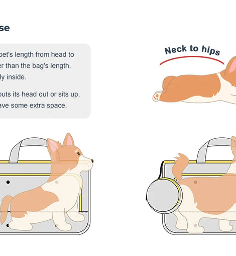 • Not Suitable: Corgi (body length exceeds limit), French Bulldog (weight/body width exceed limit), Bichon Frise (many are overweight or bulky)