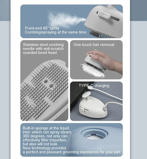 4.Use Simply: Charge the pet steam brush anytime and anywhere with the convenient TYPE-C charging interface; the 1-touch hair release function easily cleans hair entangled on the combing needles