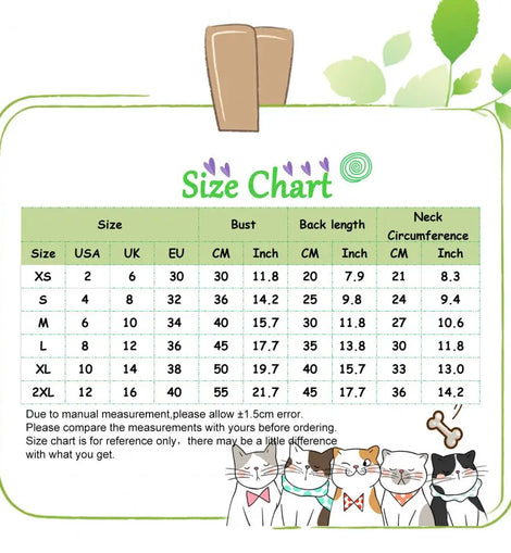 Size: XS, Bust: 30cm/11.8", Back Length: 20cm/7.9", Neck Circumference: 21cm/8.3" (Approx.)