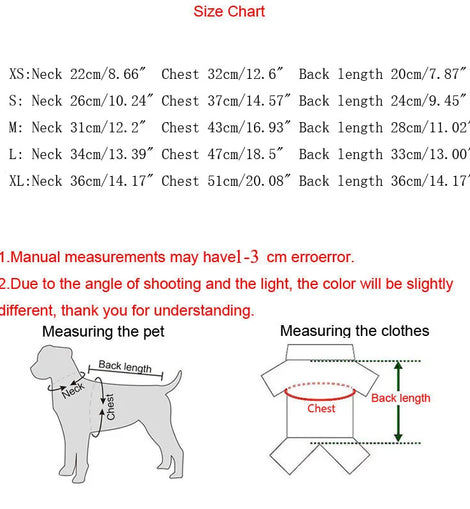 XS:neck 22cm/8.66''   chest 32cm/12.6''    back length 20cm/7.87''